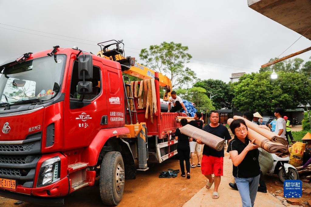 9月11日,在廣西北海市合浦縣白沙鎮虎嶺村,群眾和政府工作人員將被褥、竹席等物資搬入安置點(diǎn)。