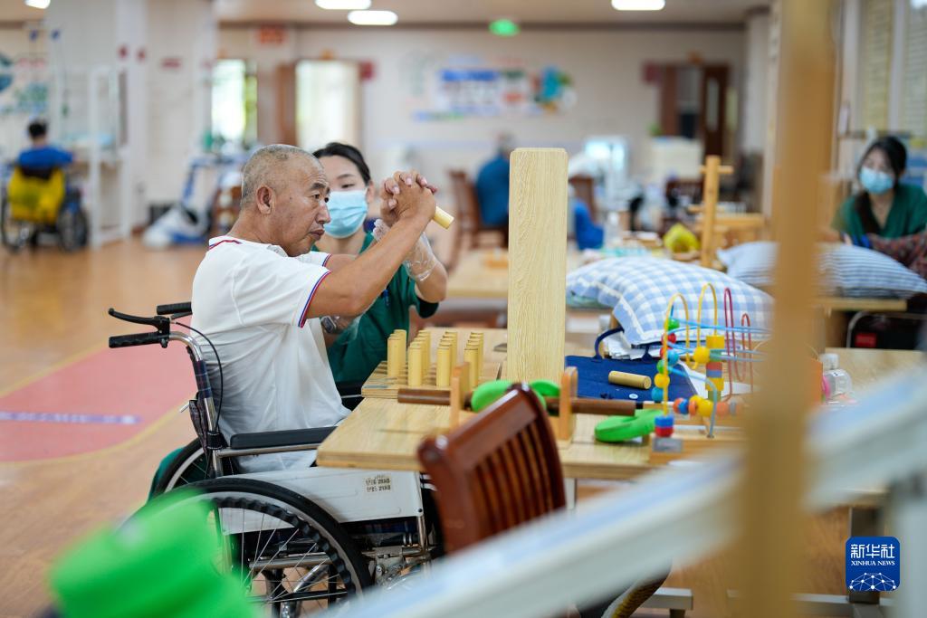 9月12日,河北省唐山市古冶區一家養老機構的工作人員指導老人進(jìn)行手部康復訓練。