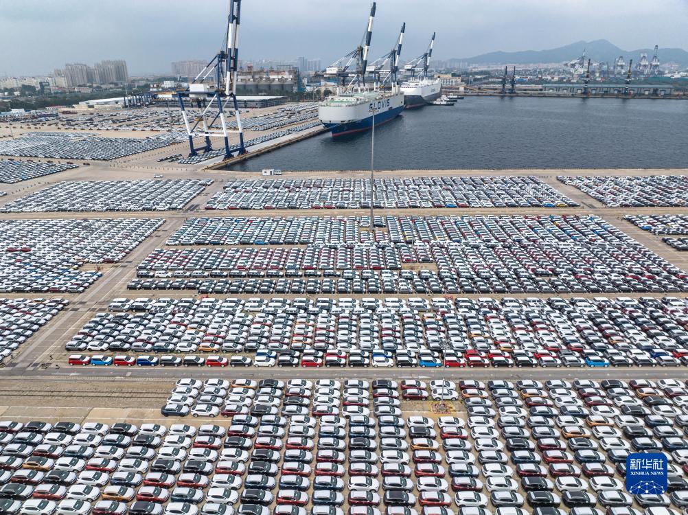 9月12日,在山東港口煙臺港汽車(chē)碼頭,大批出口商品車(chē)等待裝船發(fā)運(無(wú)人機照片)。