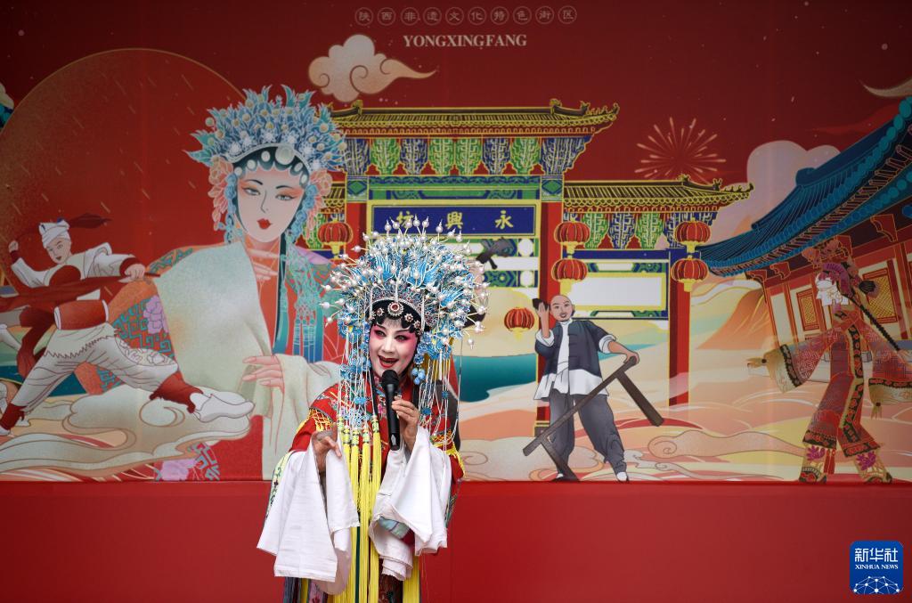 9月12日,西安市新城區“遇見(jiàn)城墻·非遺韻”非遺集市上,表演者在進(jìn)行秦腔演出。