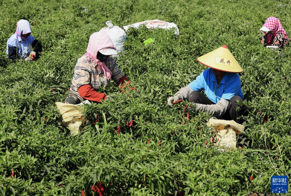 9月12日,唐山市豐南區東田莊鄉大吳莊戶(hù)村的農民在田間采收辣椒。