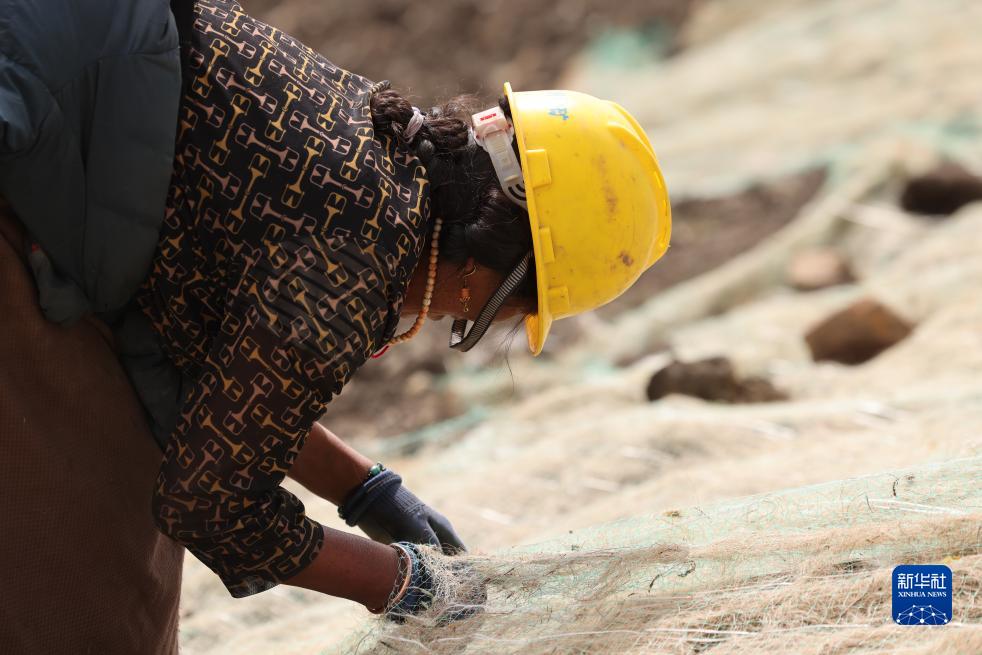 在若爾蓋縣達扎寺鎮多瑪村廢棄礦山治理點(diǎn),工人在邊坡上鋪椰絲毯(8月23日攝)。