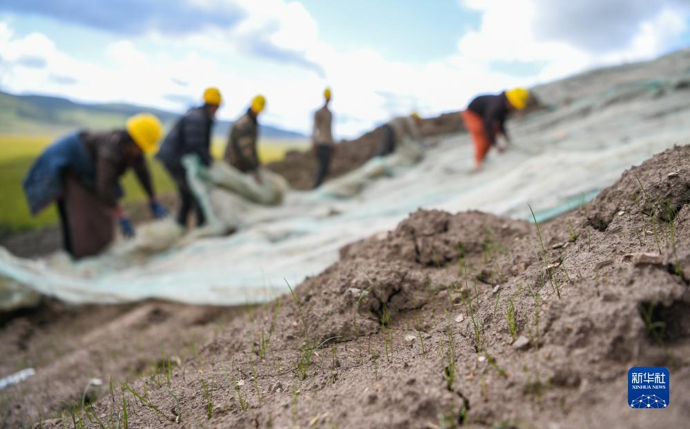 若爾蓋縣唐克鎮嘎?tīng)柆敶宓牟菰鷳B(tài)修復項目已完成近三個(gè)月。披堿草、老芒麥、高冰草和黑麥草等從椰絲毯織成的小方格中破土而出,最高已近半米,成為攻克生態(tài)修復難點(diǎn)、治愈草原“傷疤”的希望。