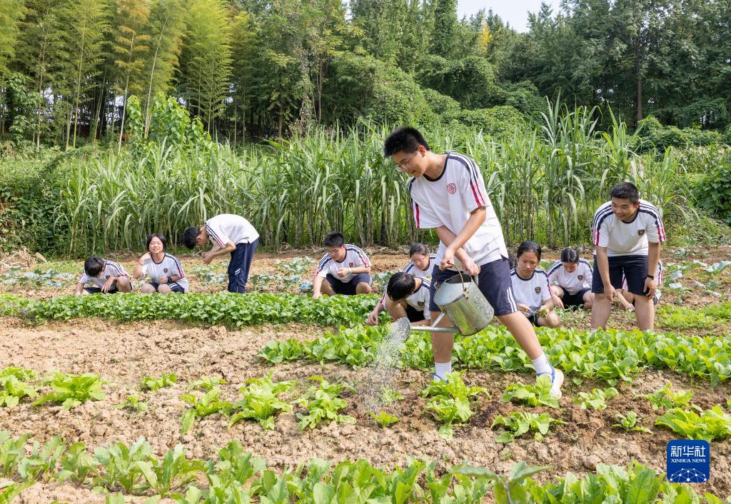 9月12日,浙江省諸暨市學(xué)勉中學(xué)的學(xué)生在菜園澆菜、除草。