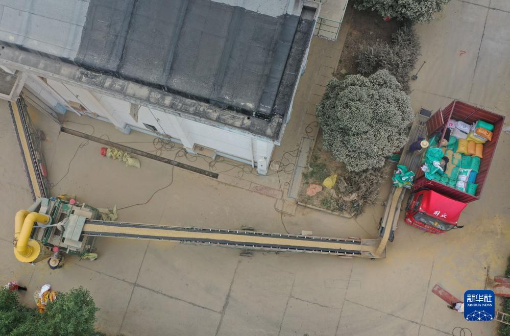 9月12日,在湖南省衡南縣三塘鎮,衡陽(yáng)一家糧食收儲企業(yè)的工作人員在卸糧入庫(無(wú)人機照片)。