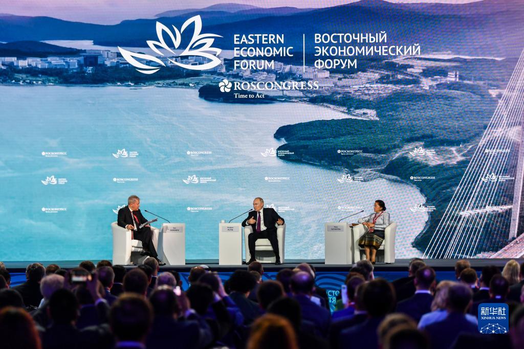 9月12日,俄羅斯總統普京(中)在第八屆東方經(jīng)濟論壇全體會(huì )議上講話(huà)。
