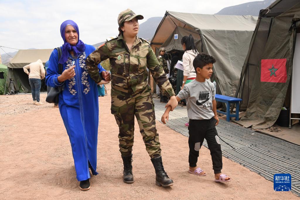 9月12日,救援人員在位于摩洛哥豪茲省艾斯尼村的臨時(shí)軍事醫院引導災民。