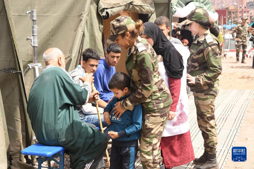 9月12日,救援人員在位于摩洛哥豪茲省艾斯尼村的臨時(shí)軍事醫院引導災民。