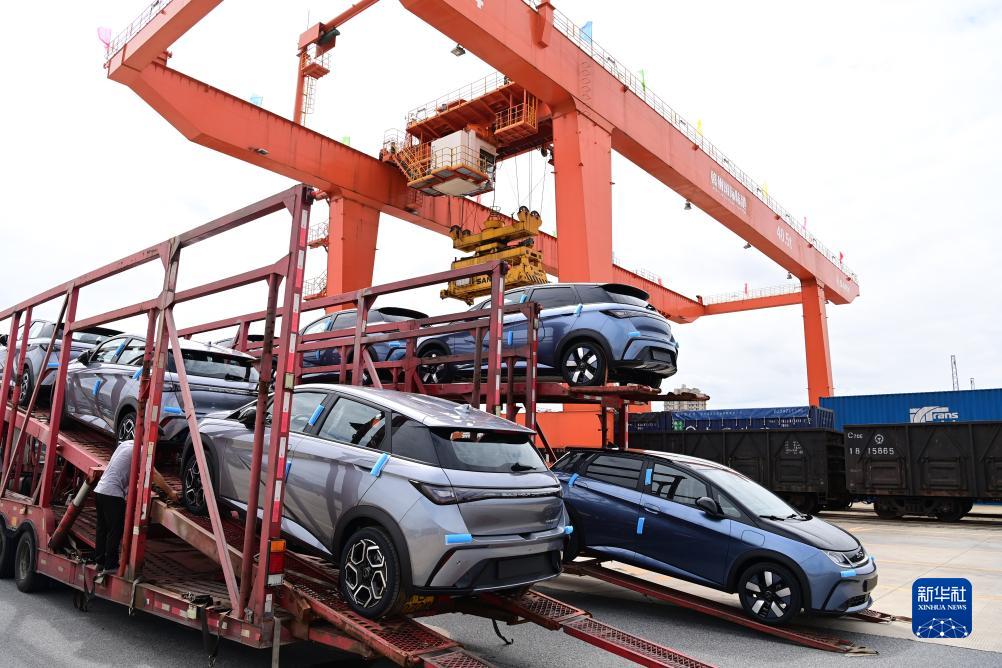 9月13日,在江西贛州國際陸港,新能源汽車(chē)被運至港口。
