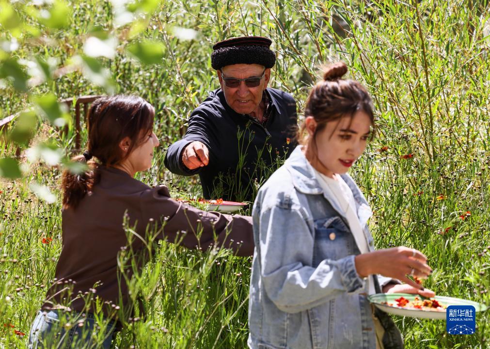 9月4日,村里的年輕人前來(lái)巴依卡老人家中,幫助他采摘家里種植的雪菊。新華社記者 蘭紅光 攝