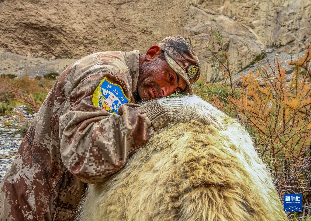 2014年9月25日,拉齊尼趴在陪伴自己巡邊10年后身負重傷犧牲的白牦牛身上,非常難過(guò)。新華社發(fā)(王烈 攝)