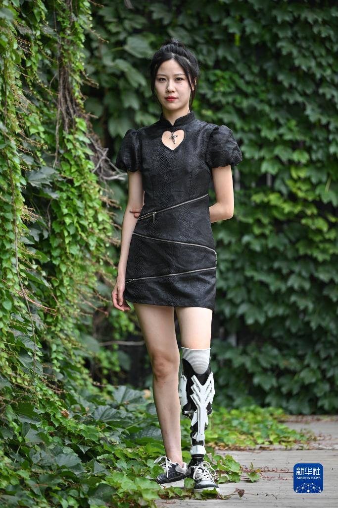 胡月穿戴自己設計的假肢留影(6月20日攝)。新華社記者 胥冰潔 攝
