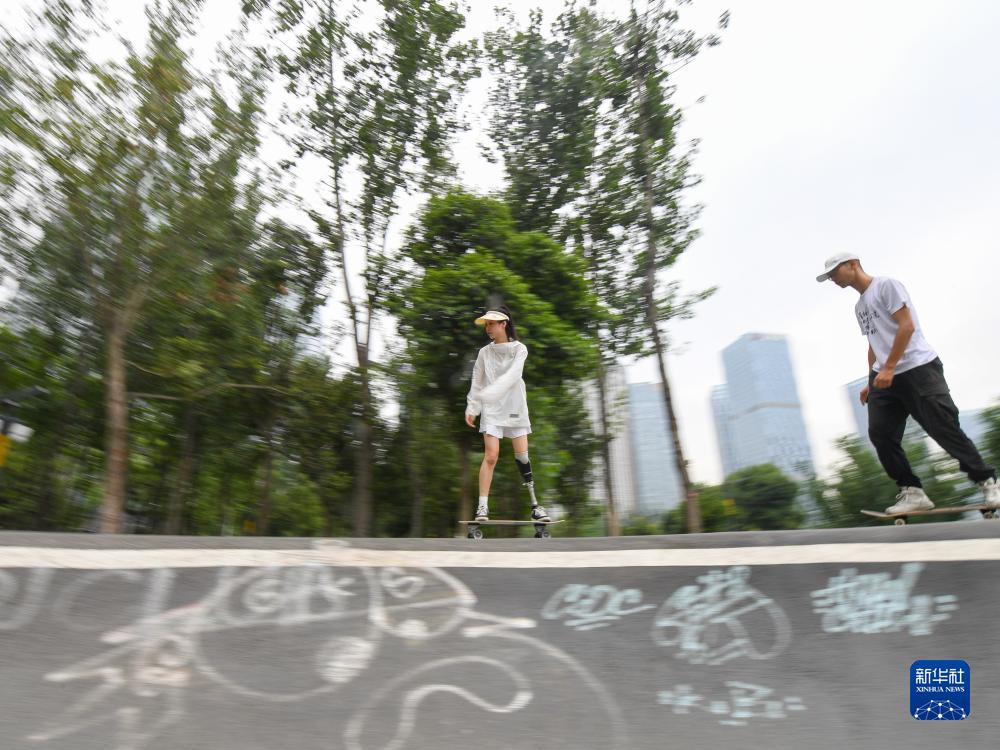 在成都市錦江區輕極限運動(dòng)公園,胡月(左)和滑板愛(ài)好者在練習滑板(6月20日攝)。新華社記者 王曦 攝