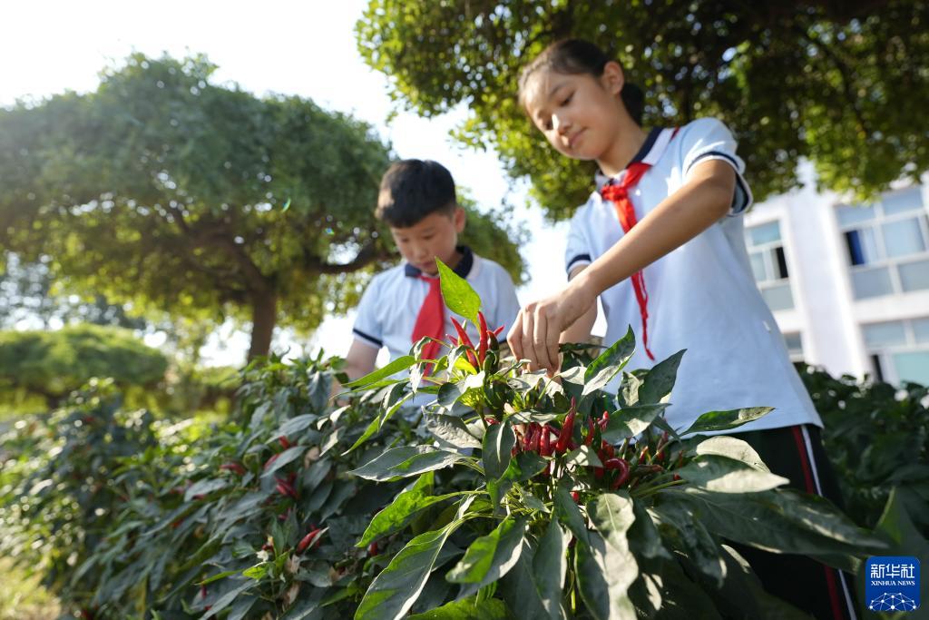 9月13日,河北省樂(lè )亭縣汀流河小學(xué)的學(xué)生在“校園農場(chǎng)”內采摘辣椒。
