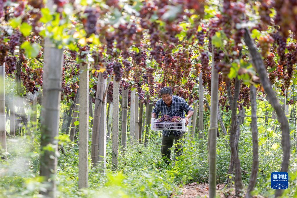 9月13日,浙江省諸暨市安華鎮珠峰村的果農在采摘巨峰葡萄。