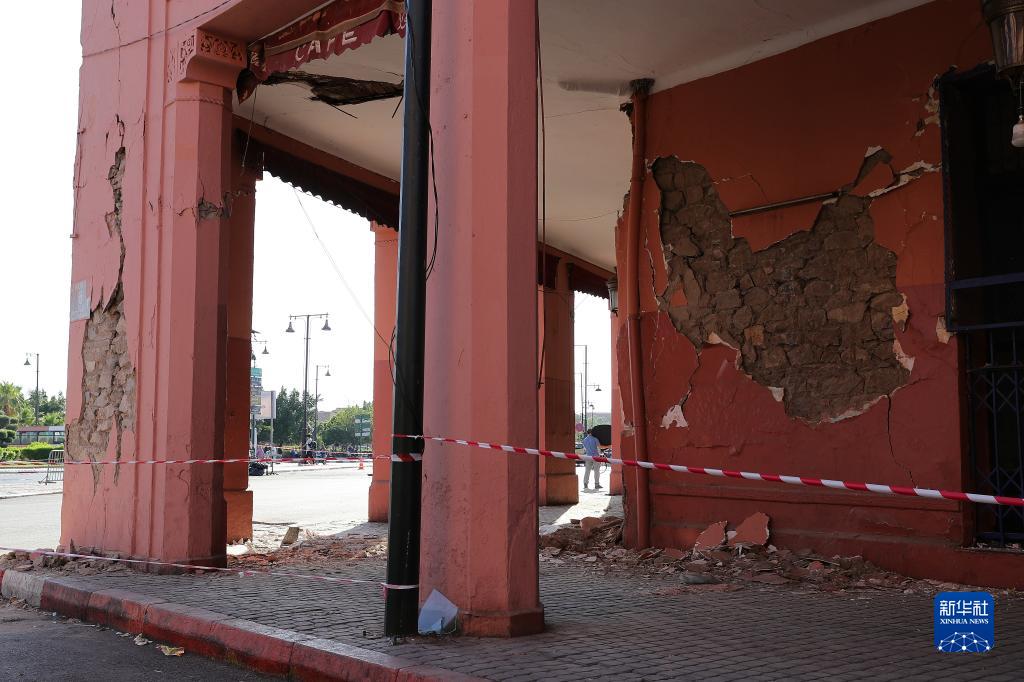 這是9月13日在摩洛哥馬拉喀什老城拍攝的一處震后受損建筑。