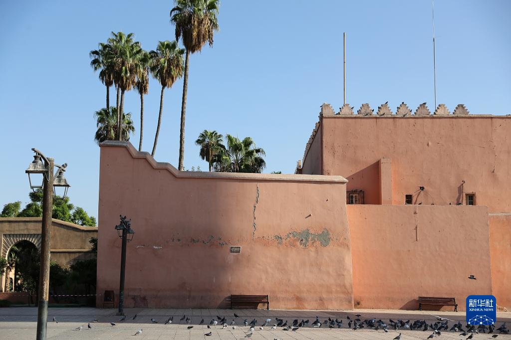 這是9月13日在摩洛哥馬拉喀什老城拍攝的庫圖比亞清真寺外墻。該清真寺目前已暫停開(kāi)放。