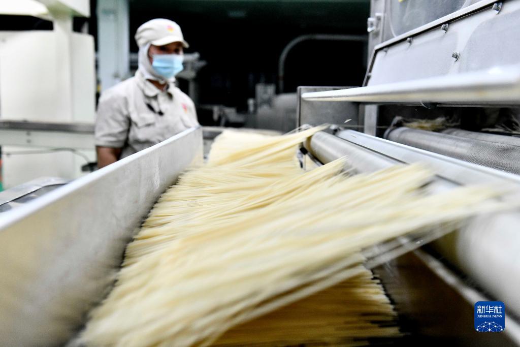 9月12日,在濱州中裕食品有限公司掛面生產(chǎn)車(chē)間,工作人員在流水線(xiàn)上值守。