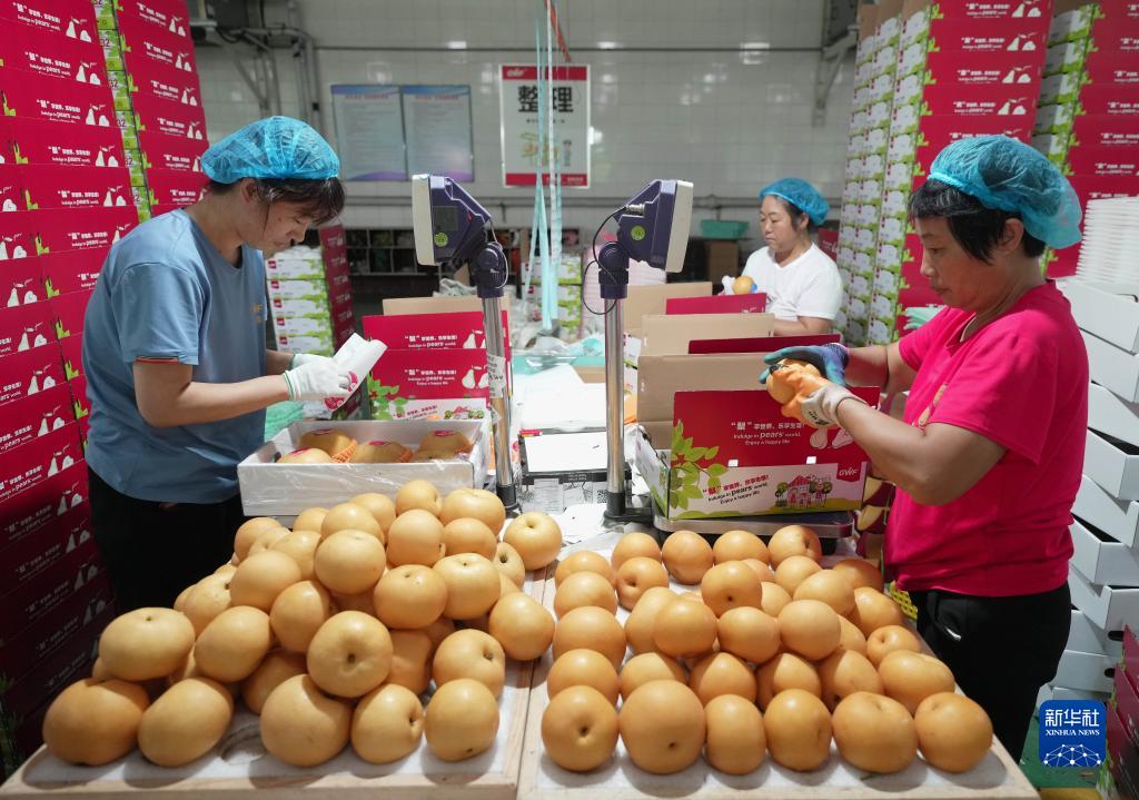 9月14日,工人在河北省晉州市一家梨果銷(xiāo)售企業(yè)分揀秋月梨。