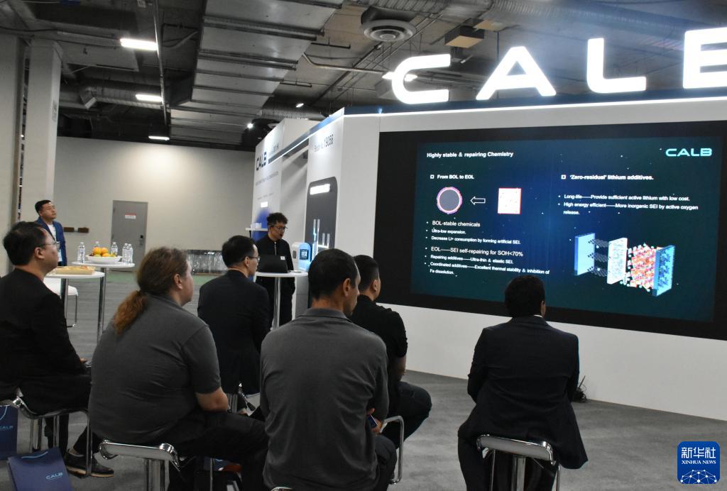 9月12日,在美國拉斯維加斯舉行的北美最大清潔能源展會(huì )RE+展會(huì )的中國企業(yè)中創(chuàng )新航展區,參觀(guān)者聽(tīng)取產(chǎn)品介紹。
