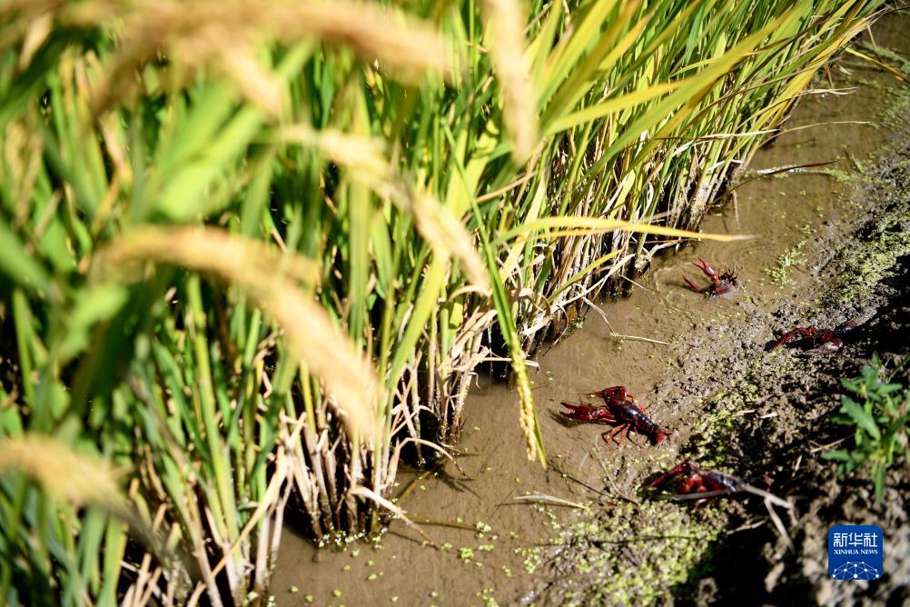 由鹽堿地改良而成的樂(lè )亭縣數字循環(huán)農業(yè)智慧園區稻蝦共生區內的小龍蝦(9月14日攝)。