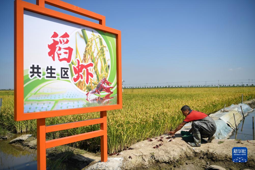 9月14日,在由鹽堿地改良而成的樂(lè )亭縣數字循環(huán)農業(yè)智慧園區稻蝦共生區,工作人員在投放小龍蝦。