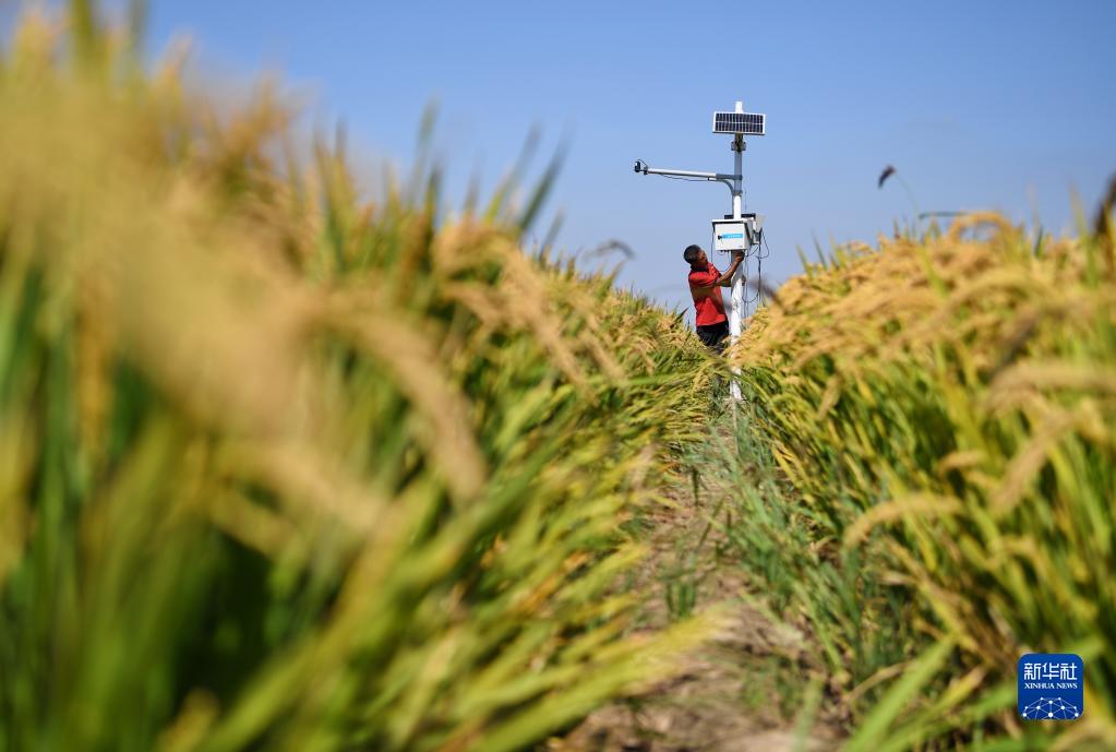 9月14日,在由鹽堿地改良而成的樂(lè )亭縣數字循環(huán)農業(yè)智慧園區,工作人員在調整水稻田監控設施。