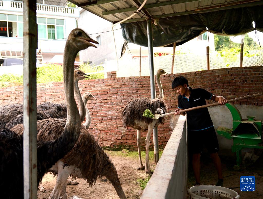 9月13日,吳錦彪給鴕鳥(niǎo)喂食。新華社記者 胡晨歡 攝