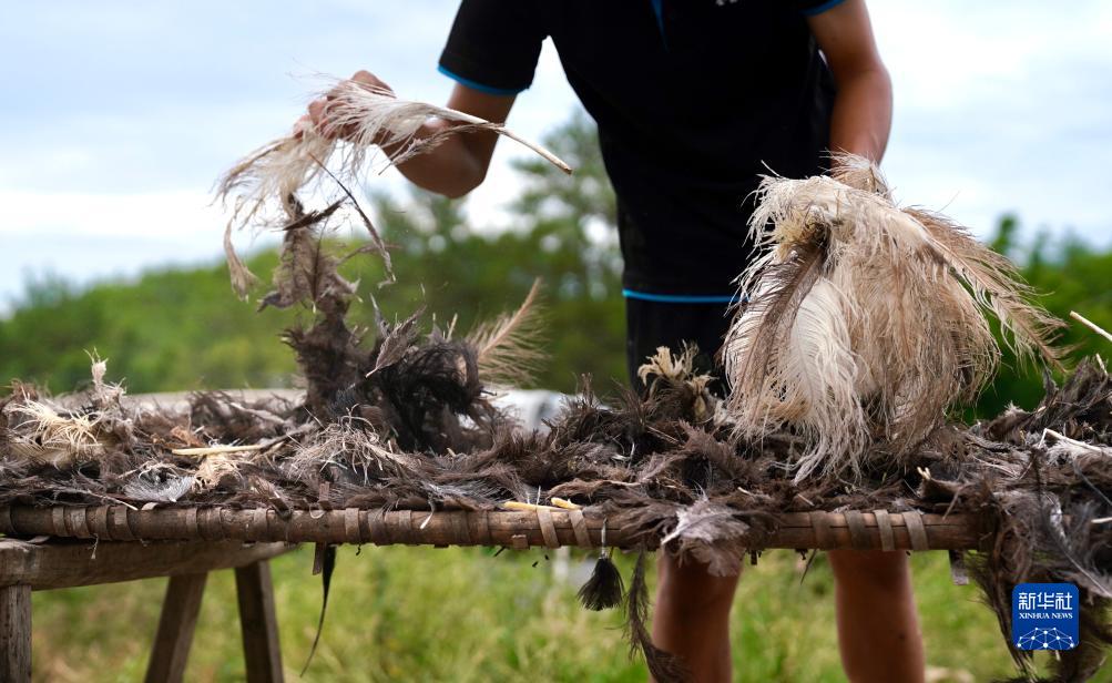 9月13日,吳錦彪篩選用來(lái)銷(xiāo)售的鴕鳥(niǎo)羽毛。新華社記者 胡晨歡 攝