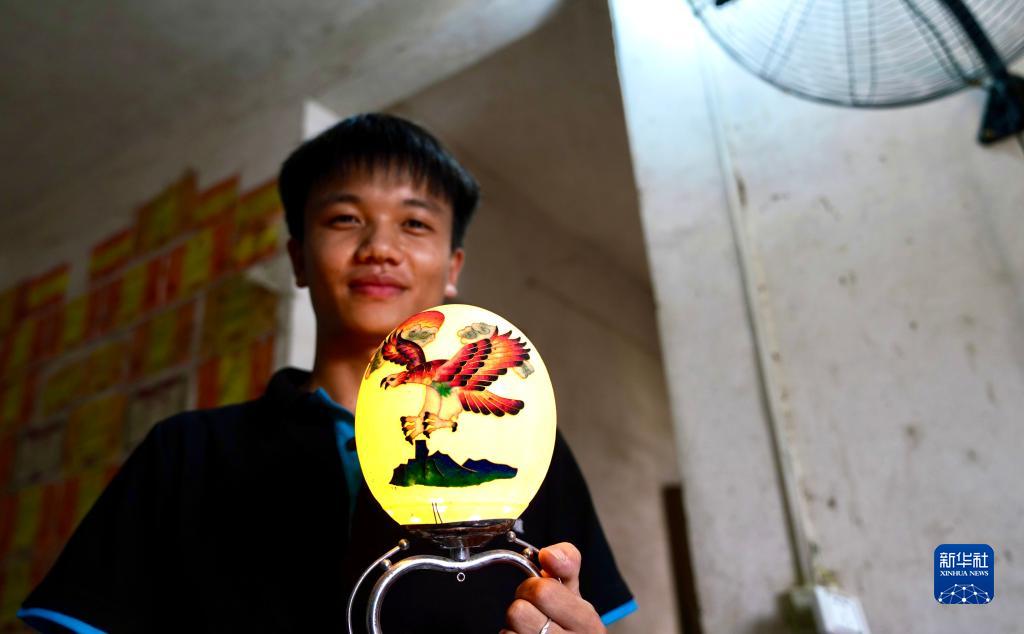 9月13日,吳錦彪展示用鴕鳥(niǎo)蛋制作的燈類(lèi)產(chǎn)品。新華社記者 胡晨歡 攝