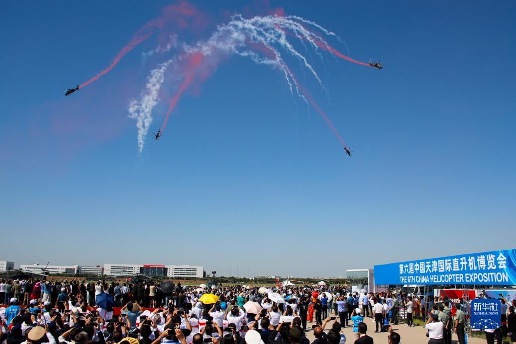 當日,第六屆中國天津國際直升機博覽會(huì )在天津市空港經(jīng)濟區開(kāi)幕。陸軍“風(fēng)雷”飛行表演隊在開(kāi)幕式上進(jìn)行飛行表演,先后向觀(guān)眾演示三機芭蕾、尾追螺旋、四機開(kāi)花等8個(gè)課目的特技飛行動(dòng)作,展示了陸軍航空兵部隊轉型建設和實(shí)戰化訓練成效。