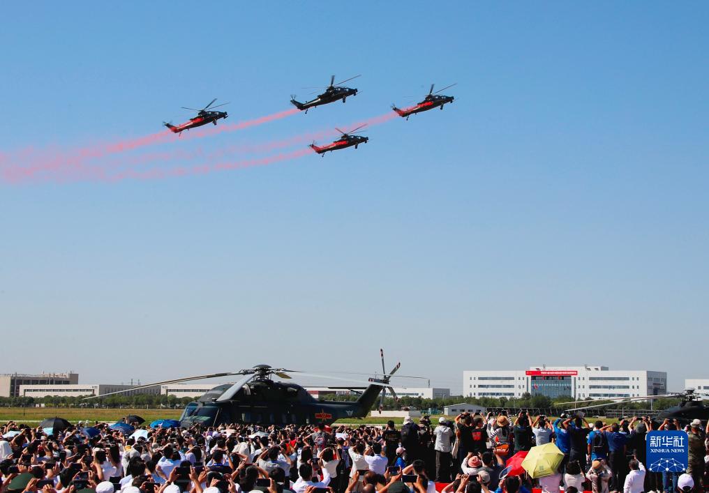 9月14日,在第六屆中國天津國際直升機博覽會(huì )開(kāi)幕式上,陸軍“風(fēng)雷”飛行表演隊直-10武裝直升機進(jìn)行飛行表演。