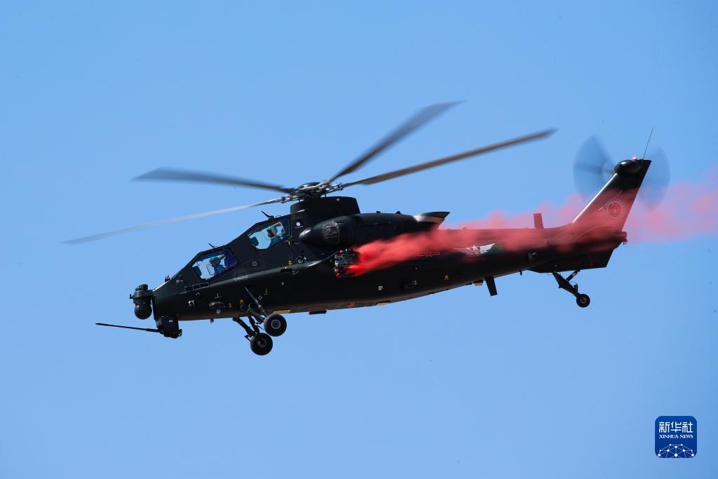 9月14日,在第六屆中國天津國際直升機博覽會(huì )開(kāi)幕式上,陸軍“風(fēng)雷”飛行表演隊直-10武裝直升機進(jìn)行飛行表演。