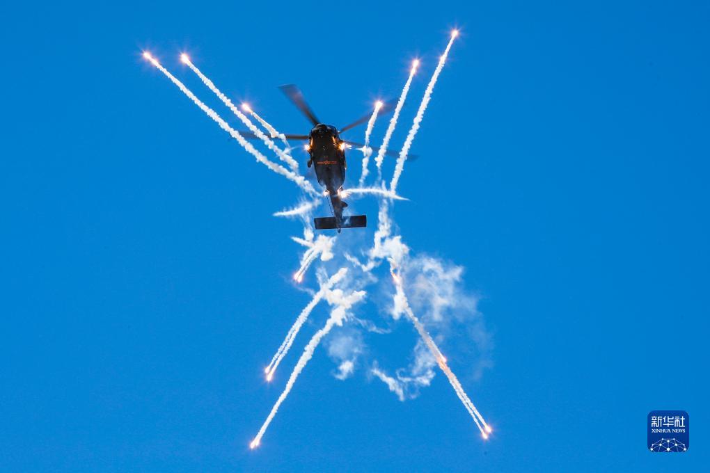 9月14日,在第六屆中國天津國際直升機博覽會(huì )開(kāi)幕式上,陸軍“風(fēng)雷”飛行表演隊直-20戰術(shù)通用直升機發(fā)射干擾彈。