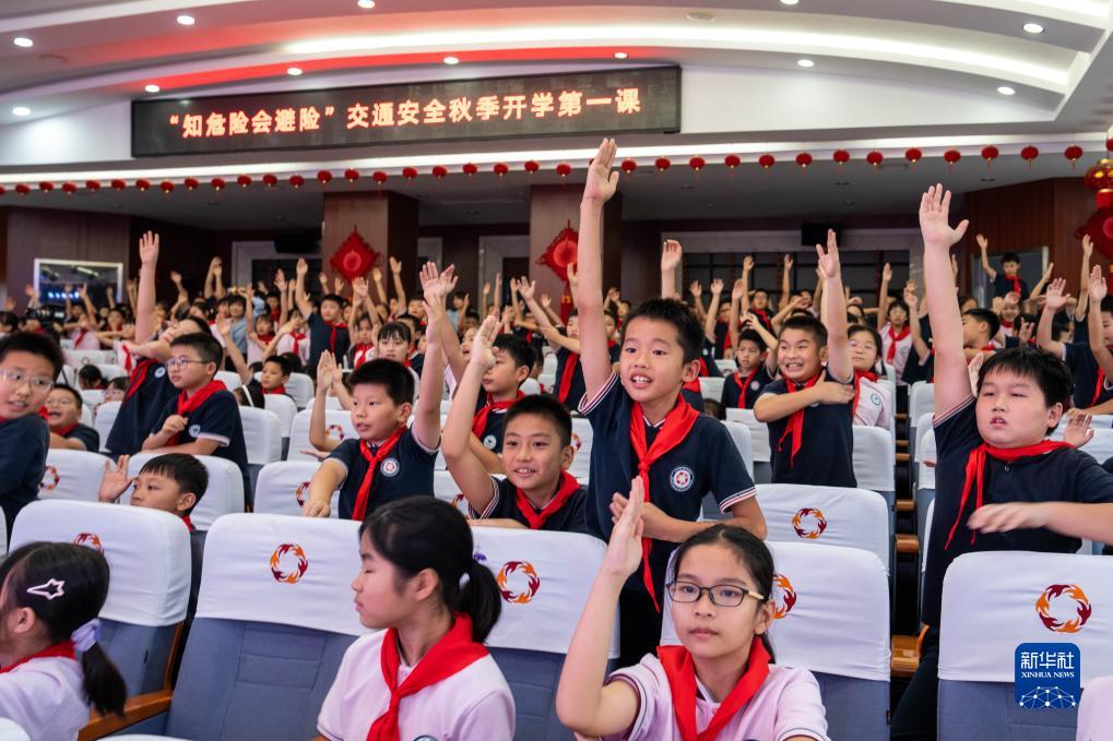 9月14日,在新世博寄宿制小學(xué),學(xué)生在活動(dòng)現場(chǎng)舉手回答交通安全問(wèn)題。
