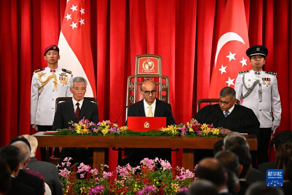 9月14日,當選總統尚達曼(中)在新加坡總統府出席宣誓就職儀式。