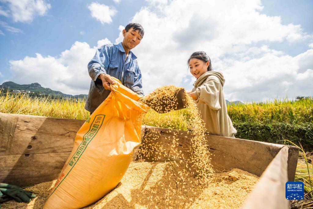 9月14日,村民在貴州省畢節市大方縣小屯鄉小屯梯田里收集脫粒的稻谷。