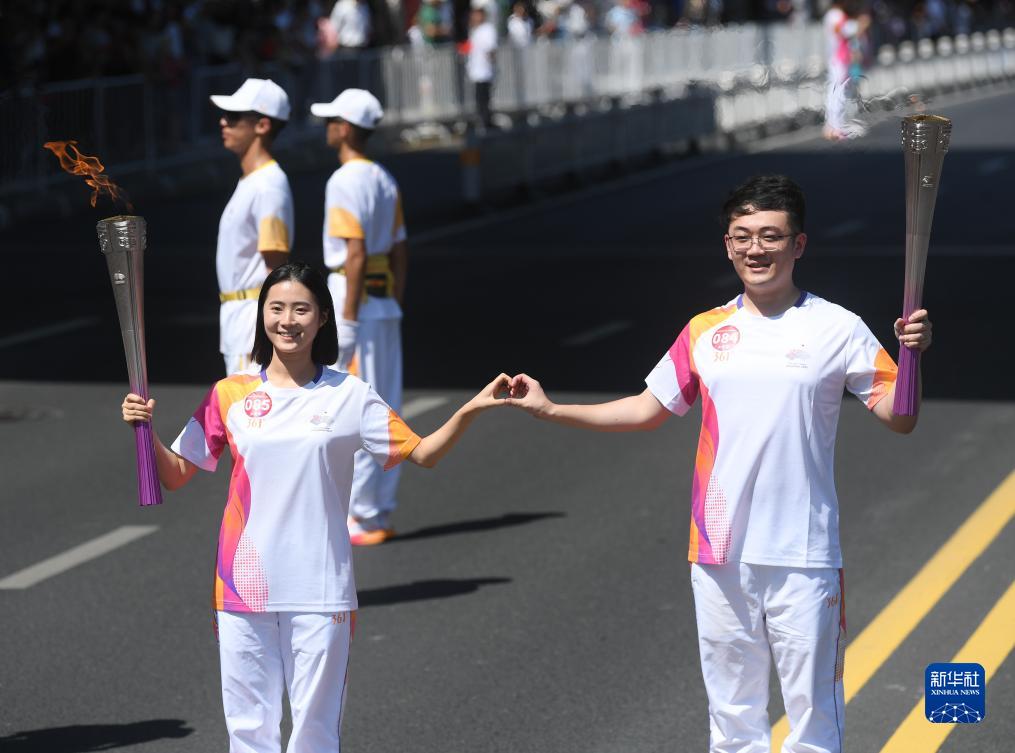9月15日,火炬手王子震(右)和項珍珍在火炬傳遞中。