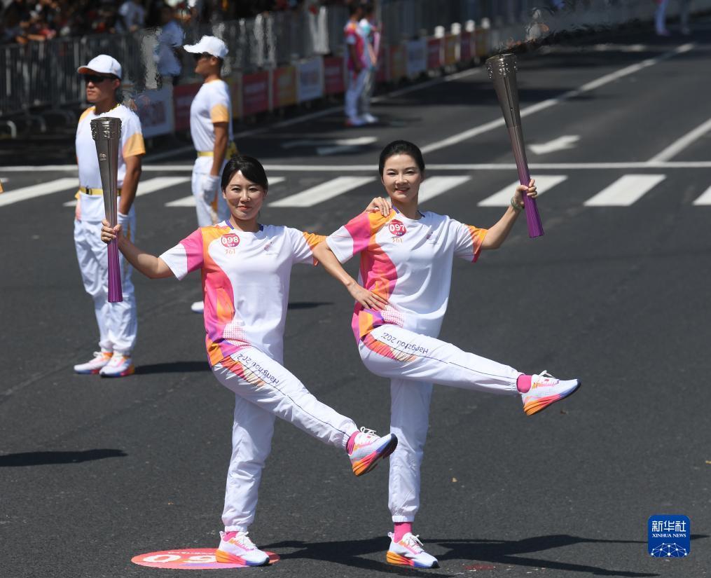 9月15日,火炬手劉嬋娟(右)和閆鶯在火炬傳遞中。