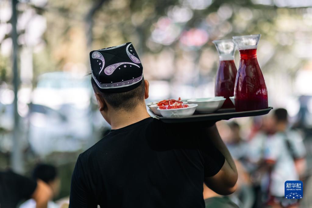 9月14日,在烏茲別克斯坦首都塔什干,工作人員運送石榴汁。
