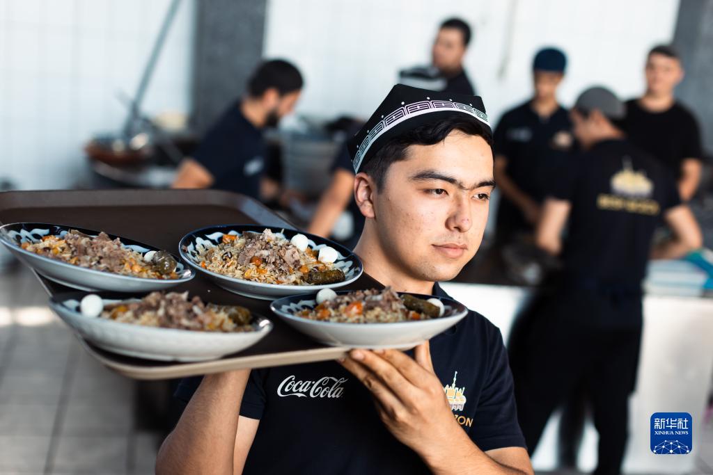 9月14日,在烏茲別克斯坦首都塔什干,工作人員運送抓飯。