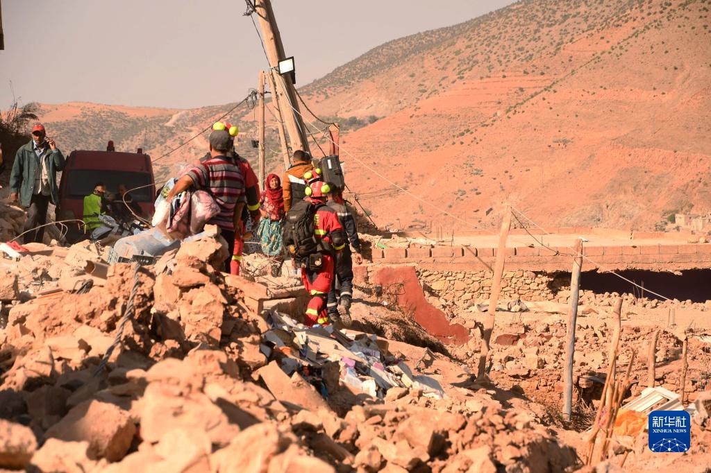 9月14日,救援人員在位于摩洛哥豪茲省的伊姆利勒村的地震廢墟上搜救。