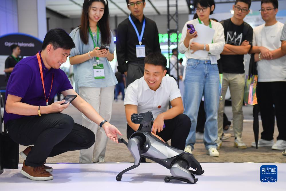 9月15日,參觀(guān)者在2023世界計算大會(huì )專(zhuān)題展上了解機器狗并與其互動(dòng)。