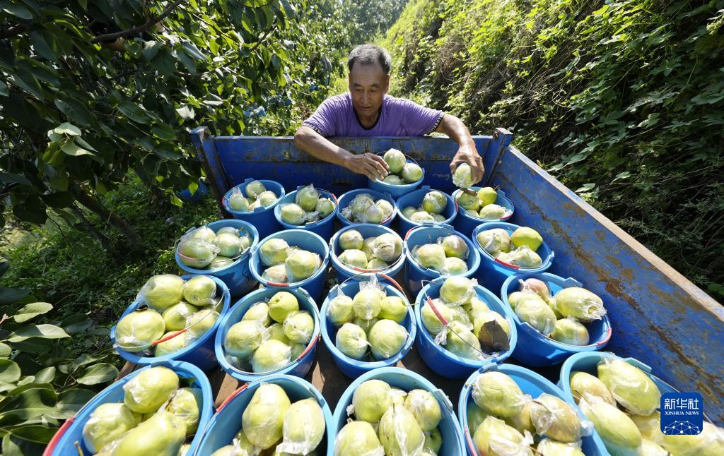 9月15日,農民在河北省玉田縣唐自頭鎮一處經(jīng)荒山開(kāi)發(fā)而建的果園內整理剛剛采摘的鮮梨。