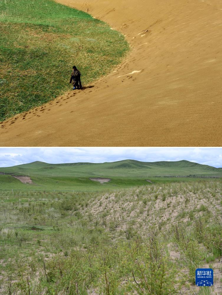 拼版照片:上圖為2011年6月9日,甘南藏族自治州瑪曲縣歐拉鄉歐強村村民豆格甲走在被沙丘侵入的草場(chǎng)上(新華社記者聶建江 攝);下圖為2023年7月6日在甘南藏族自治州瑪曲縣歐拉鎮歐強村拍攝的一處完成沙化治理的草場(chǎng)(新華社記者陳斌攝)。