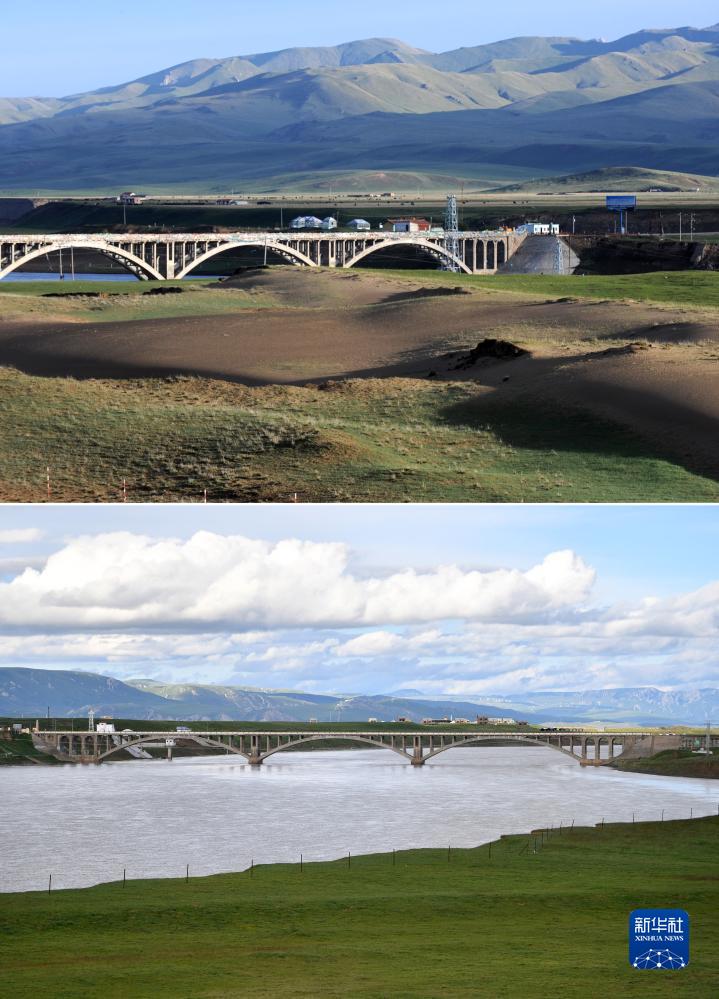 拼版照片:上圖為2011年6月10日在甘南藏族自治州瑪曲縣城郊的黃河大橋附近拍攝的大面積沙化退化草場(chǎng)(新華社記者聶建江攝);下圖為2023年7月6日在甘南藏族自治州瑪曲縣城郊的黃河大橋附近拍攝的沙化退化草場(chǎng)已經(jīng)復綠(新華社記者陳斌攝)。