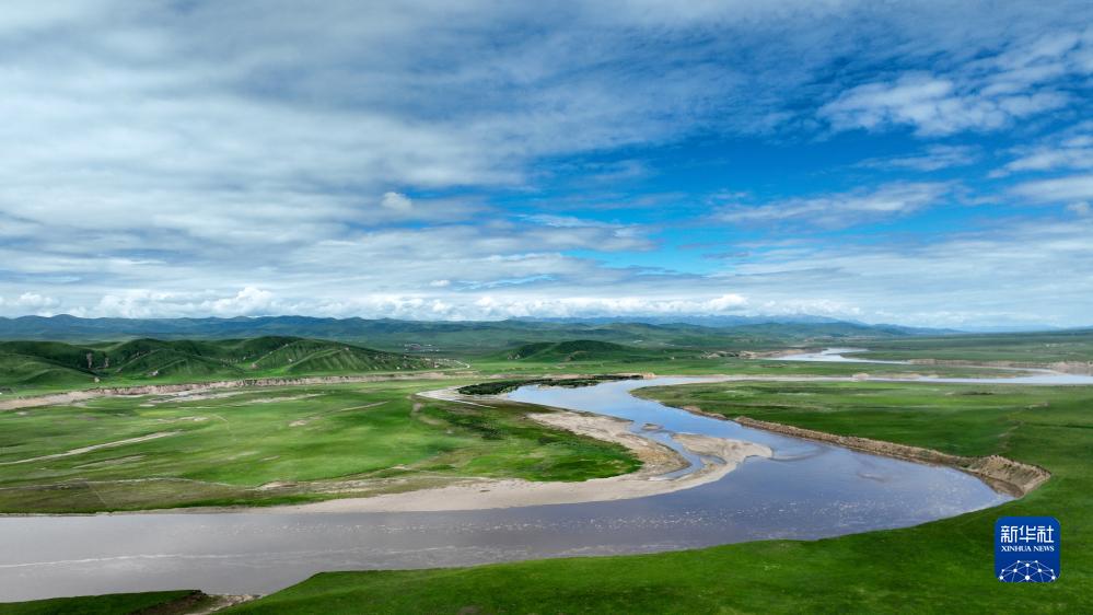 瑪曲縣黃河兩岸綠意盎然(7月6日攝,無(wú)人機照片)。