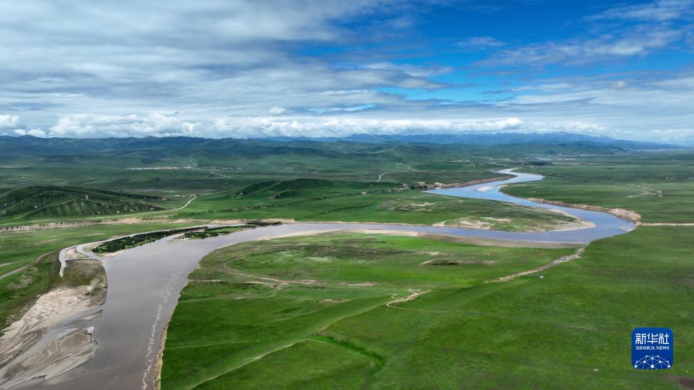 瑪曲縣黃河兩岸綠意盎然(7月6日攝,無(wú)人機照片)。