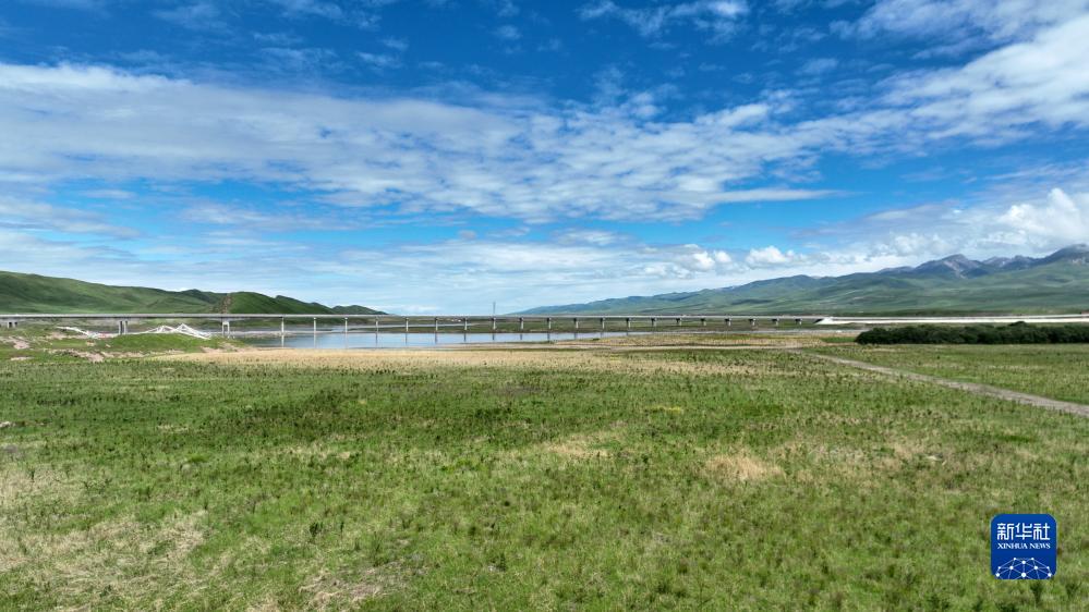 這是瑪曲縣城外黃河沿岸一處經(jīng)過(guò)治理修復的草場(chǎng)(7月6日攝,無(wú)人機照片)。