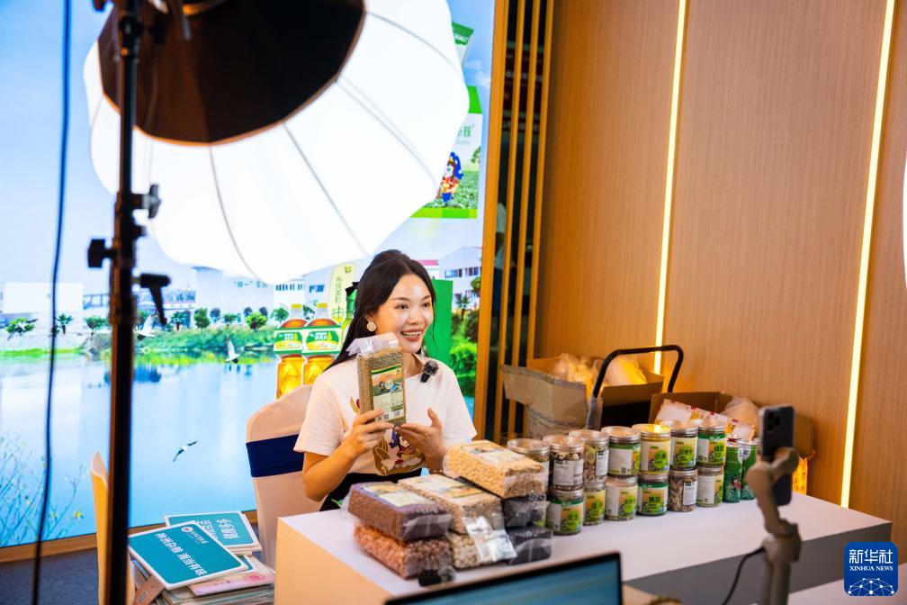 9月15日,在長(cháng)沙國際會(huì )展中心,參展商通過(guò)直播推銷(xiāo)雜糧。